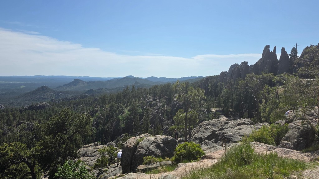 We drove from Rapid City through the Black Hills. We came upon the Black Hills expecting to see hills, but instead, we saw mountains, at least as grandiose as the Appalachians. The name ‘Black Hills’ comes from the Lakota words Paha Sapa, meaning ‘hills that are black.’ From a distance, the densely forested slopes appear dark against the prairie, hence the name. Indeed, when we first saw them as we drove West towards Rapid City, that was precisely how they looked. We drove from Rapid City past Mount Rushmore and onto Hill City and then continued on the Needles Highway through the heart of the hills. The Highway was stunning. The road winded through towering rocks, with barely room for cars to pass in each direction, and several times plunged through tiny needle-hole tunnels, where one car could barely fit. The views were literally breathtaking. It was one of the most scenic journeys I have ever been on, and I had no idea that the Black Hills were so beautiful.